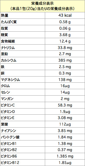 アカシア食物繊維、難消化性デキストリン、紅茶エキス末、海藻粉末、果糖、玄米胚芽抽出物、グルコマンナン、乳酸菌(EC-12)、乳酸菌(FK-23)、イソマルトオリゴ糖、穀物麹、穀物発酵エキス、亜鉛含有酵母、マンガン含有酵母、セレン含有酵母、銅含有酵母、ビタミンE、クロム含有酵母、有胞子性乳酸菌、グァーガム、キサンタンガム、クエン酸、ビタミンC、甘味料(スクラロース)、ヘム鉄、ナイアシン、パントテン酸カルシウム、ビタミンB1、ビタミンB6、ビタミンB2、葉酸、ビタミンD、ビタミンB12