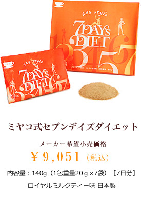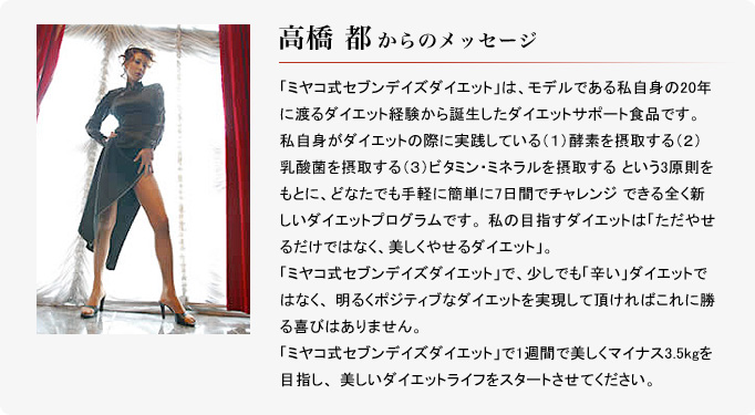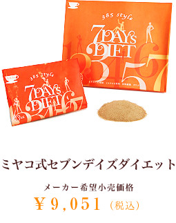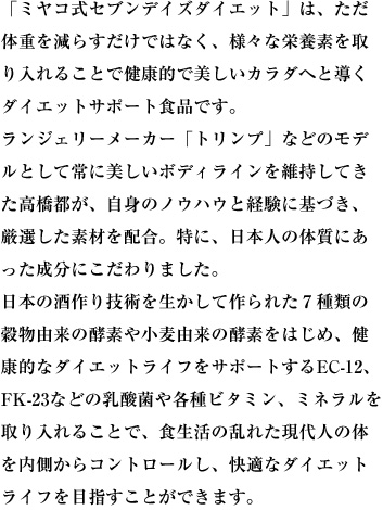 ダイエットが長続きしない方、年齢的にただやせるのではなく健康的に美しくなりたい方。そんな方に手軽に取り入れていただけるのが「ミヤコ式セブンデイズダイエット」です。