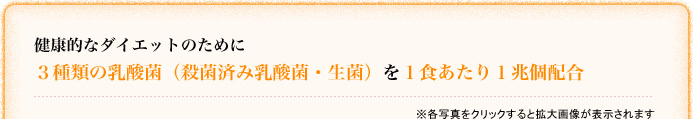また、殺菌済み乳酸菌に加え、生きている乳酸菌「ラクリスS」も配合し、しっかりと健康的なダイエットをサポートします。これならヨーグルトを沢山食べるより効率的。1 兆個の乳酸菌を摂取するためには約1000 個のヨーグルト(100g)を摂取する必要があります。
